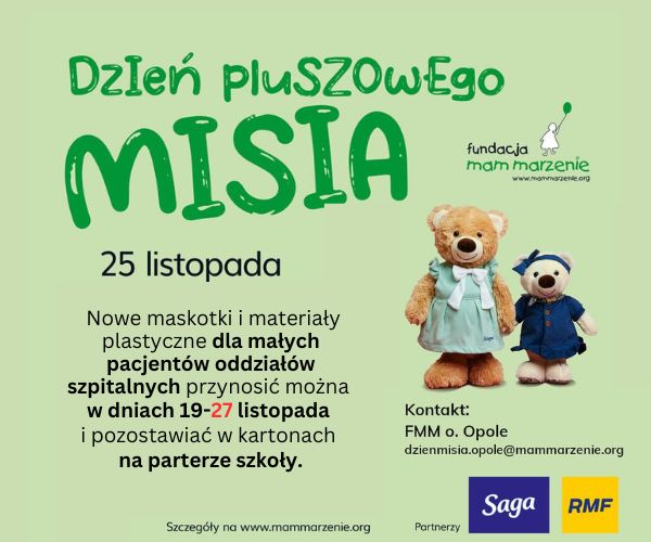 W naszej szkole włączamy się po raz drugi w zbiórkę pluszowych maskotek organizowaną na terenie całego kraju przez Fundację Mam Marzenie. Razem z Fundacją chcielibyśmy stanąć na wysokości zadania, aby uszczęśliwić dzieci przebywające na oddziałach szpitalnych. Licząc na Was – cudownych darczyńców, organizujemy zbiórkę pluszaków, ale także gier i artykułów plastycznych. Naszym celem jest zebranie jak największej ilości zabawek, ponieważ im będzie ich więcej, tym więcej uśmiechniętych dziecięcych twarzy oraz sił do walki z chorobą. Ważne jest, aby pluszaki były nowe, ponieważ bezpieczeństwo dzieci w szpitalach jest naszym priorytetem. Rozmiar i kolor maskotek nie mają znaczenia, bowiem każda zabawka doda otuchy małym, dzielnym pacjentom. Wszystkie zebrane zabawki zostaną przekazane dzieciom znajdującym się na oddziałach szpitalnych, aby wywołać bezcenny uśmiech szczęścia na ich buziach! ![]()