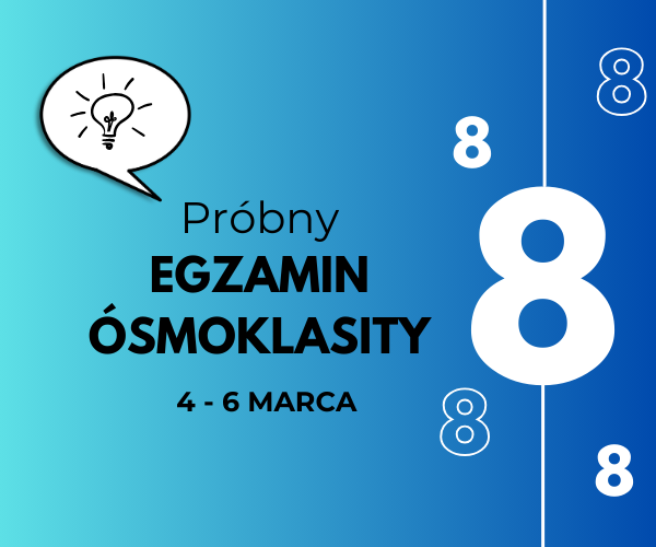 Informujemy, że w dniach 4, 5 i 6 marca 2025 r. (wtorek, środa, czwartek) o godzinie 11.30 odbędzie się próbny egzamin ósmoklasisty, który ma formę właściwego egzaminu z uwzględnieniem wszelkich dostosowań m.in. przedłużenia czasu.