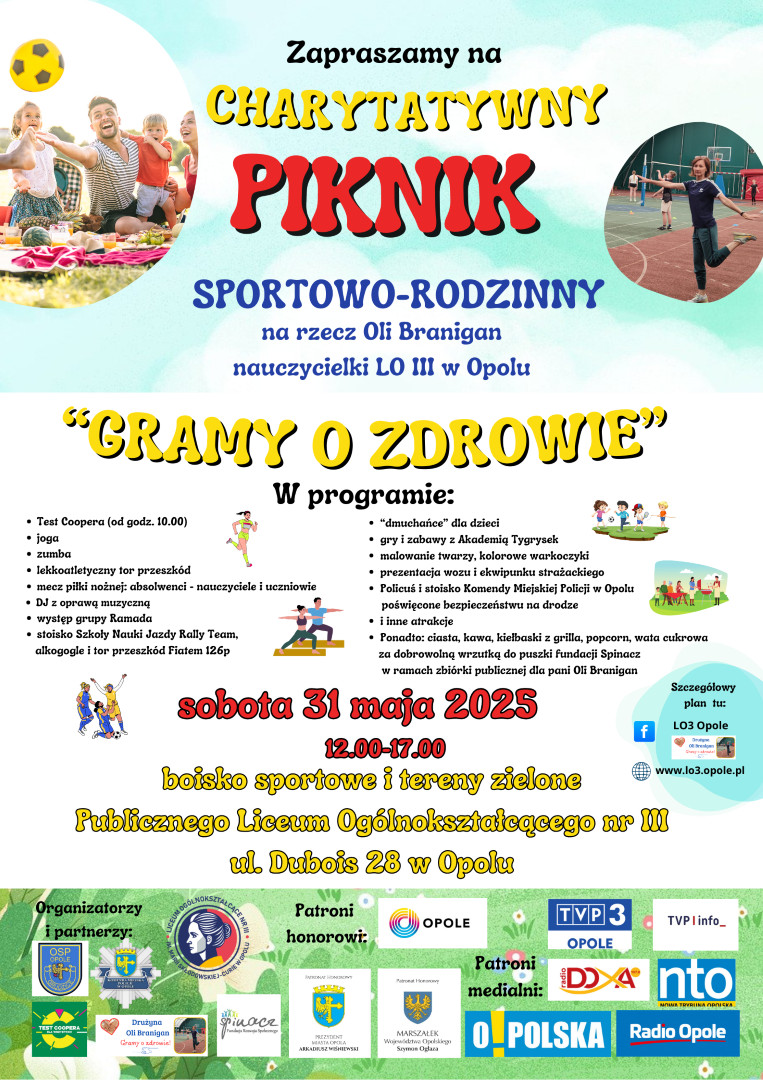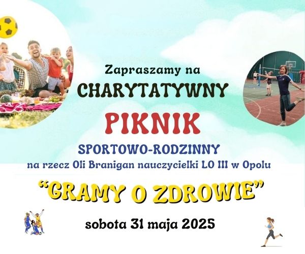 Z całego serca zapraszamy w sobotę, 31 maja 2025 r., na Piknik Sportowo-Rodzinny, organizowany przez Publiczne Liceum Ogólnokształcące nr III w Opolu. Cały dochód z wydarzenia zostanie przekazany na pomoc pani Oli.