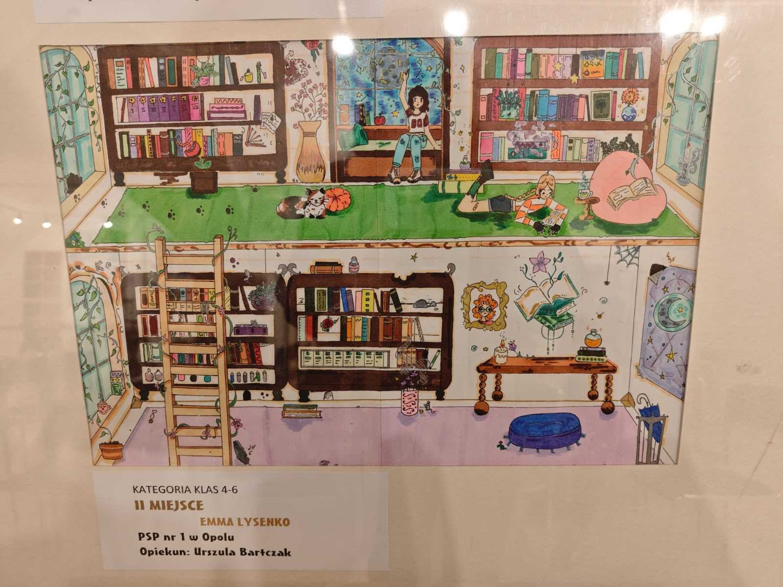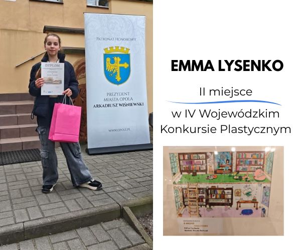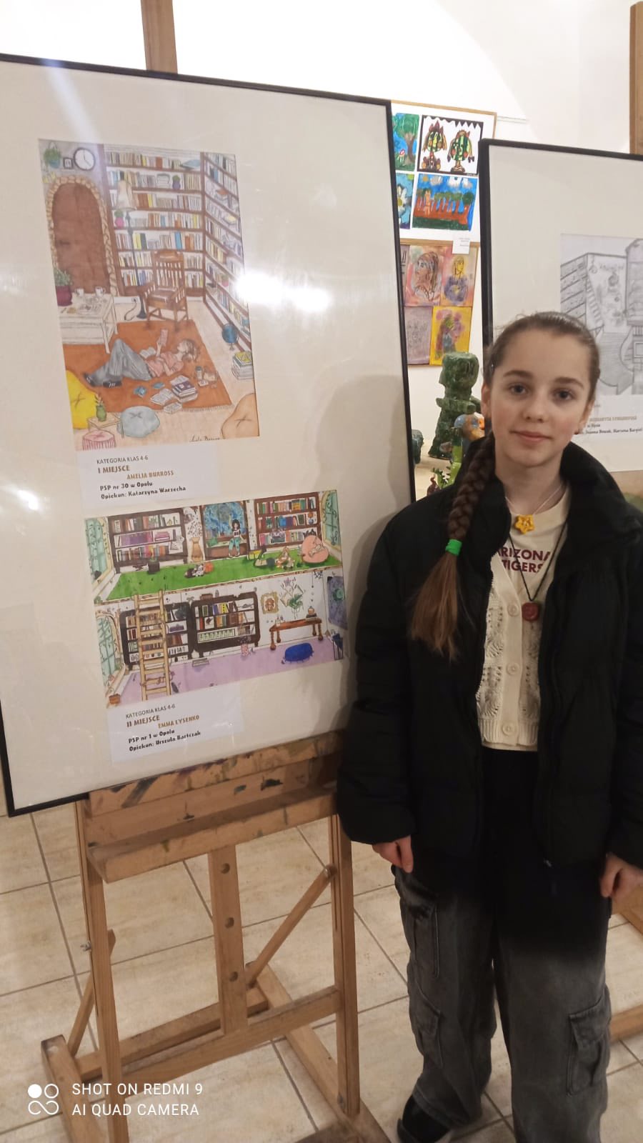 Z przyjemnością informujemy o sukcesie naszej uczennicy Emmy Lysenko z klasy 5b, która zajęła II miejsce w IV Wojewódzkim Konkursie Plastycznym „Pejzaże Miejsc – Biblioteka marzeń”.